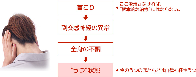 首の筋肉の異常が原因と診断されないまま的外れな治療を続けると、症状はさらに悪化し、最終的にはうつ状態になってしまいます。