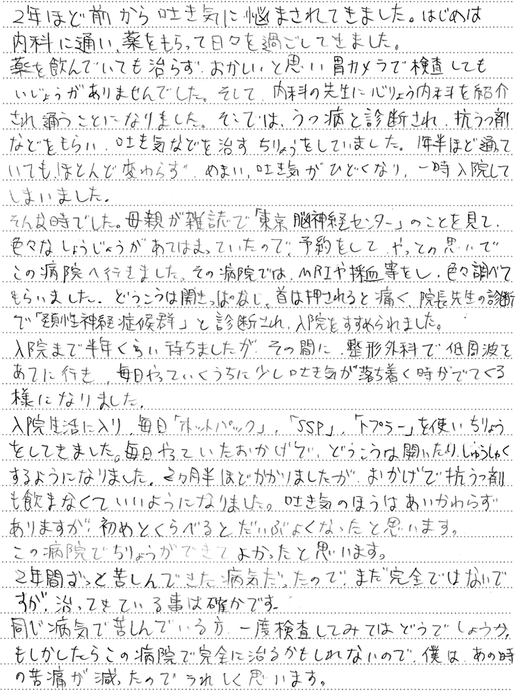そんな時でした。母親が雑誌で「東京脳神経センター」のことを見て、色々な症状が当てはまっていたので予約をして、やっとの思いでこの病院へ行きました。この病院ではMRIや採血等をし、色々調べてもらいました。瞳孔は開きっぱなし、首は押されると痛く、院長先生の診断で「頚性神経筋症候群」と診断され、入院を勧められました。入院まで半年くらい待ちましたが、その間に整形外科で低周波をあてに行き、毎日やっていくうちに少し吐き気が落ち着くときが出てくる様になりました。
