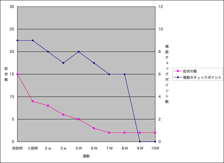 頚筋のチェックポイントは8から6に減少し、自覚症状も11から5に減少した。