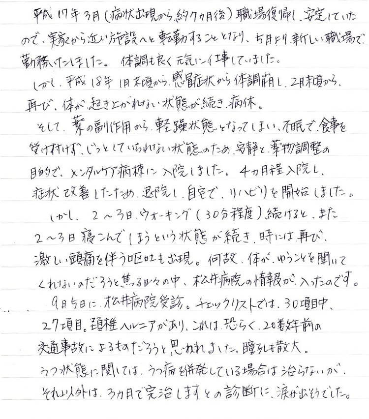 平成17年3月(症状出現から約7ヵ月後)職場復帰し、安定していたので実家から近い施設へと転勤することとなり、5月より新しい職場で勤務いたしました。体調も良く、元気に仕事していました。しかし、平成18年1月末頃から感冒症状から体調崩し、2月末頃から再び体が起き上がれない状態が続き病休。そして、薬の副作用から軽躁状態となってしまい、不眠で食事を受け付けず、じっとしていられない状態のため、安静と薬物調整の目的でメンタルケア病棟に入院しました。4ヶ月程入院し、症状改善したため退院し、自宅でリハビリを開始しました。しかし、2~3日ウォーキング(30分程度)を続けると、また2~3日寝込んでしまうという状態が続き、時には再び激しい頭痛を伴う嘔吐も出現。何故、体がゆうことを聞いてくれないのだろうと焦る日々の中、松井病院の情報が入ったのです。