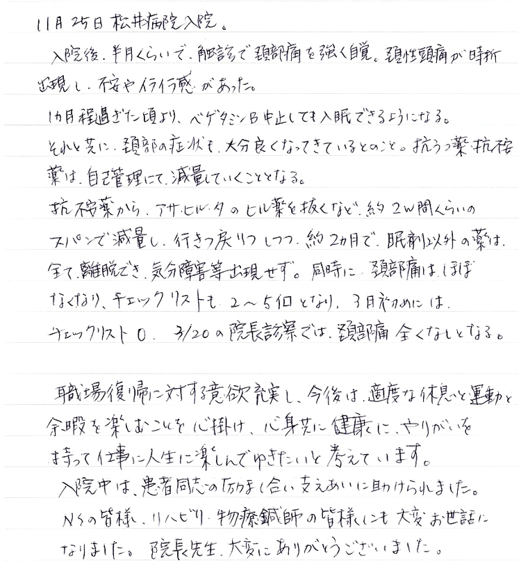 入院後、半月くらいで触診で頚部痛を強く自覚。頚性頭痛が時折出現し、不安やイライラ感があった。1ヶ月程過ぎた頃より、ベゲタミンBを中止しても入眠できるようになる。それと共に、頚部の症状も大分良くなってきているとのこと。抗うつ薬、抗不安薬は自己管理にて減量していくこととなる。抗不安薬から、朝・昼・夕の昼薬を抜くなど、約2週間くらいのスパンで減量し、行きつ戻りつしつつ、約2ヶ月で眠剤以外の薬は全て離脱でき、気分障害等出現せず。同時に頚部痛はほぼなくなり、チェックリストも2~5個となり、3月初めにはチェックリスト0。3月20日の院長診察では頚部痛全くなしとなる。