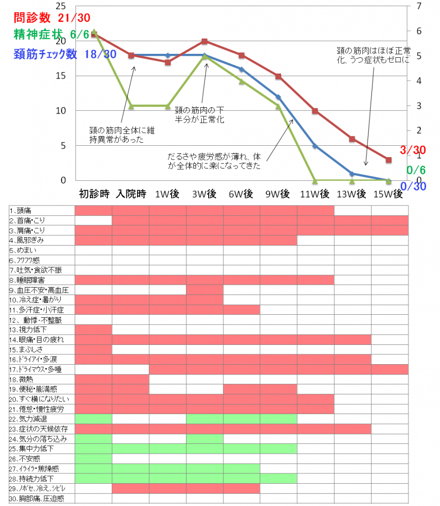 受診の結果「頚性神経筋症候群」と診断、治療が開始されひどかった頭痛・不眠症状・うつ症状・疲労感が徐々に改善され始め、薬の内服をしなくても平気な状態になった。その後、今度は肩、首の筋肉の張り・凝りという別の症状が出始め不安を感じたが、松井先生の説明、他の入院患者よりの情報により治療の過程で出現する症状と知り根気強く治療を続ける事によりその症状も改善され退院の日を迎える事が出来た。