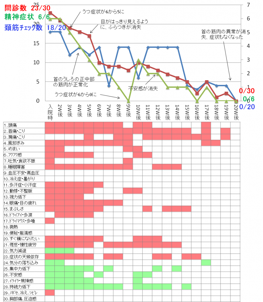 不安感などのウツ症状につきましては、あきらめかけていた3ヶ月目程で気が付くと消えていました。首のだるさ、目の奥の重い感じ、眠たい様なまぶたの脱力感、話をするのもキツイ症状はほぼ、3ヵ月半で同時にとれました。