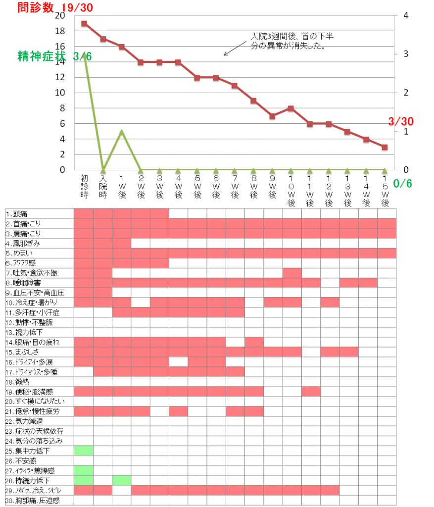 その後、治療を続けているうちに悪かった体調も少しずつ回復し安定剤も完全にやめる事が出来、無事に退院の日をむかえることが出来ました。ありがとうございます。