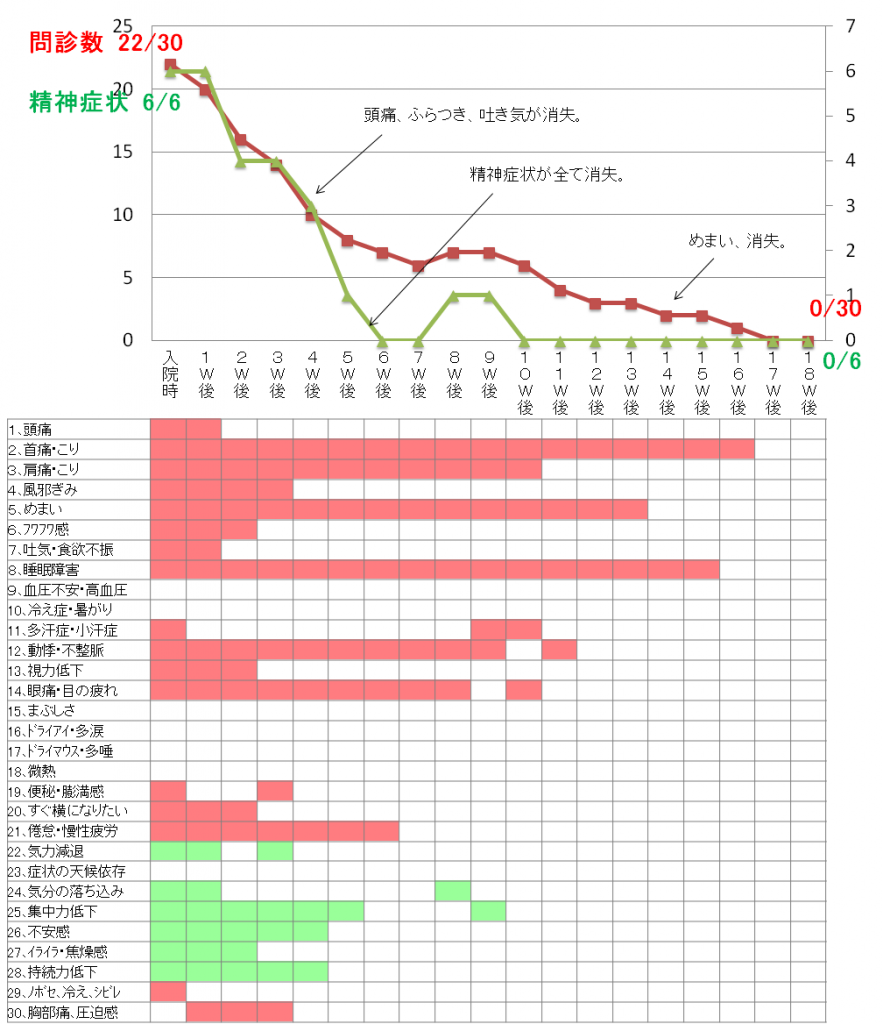 入院して1ヶ月目は、正直何の変化もなくすごく不安になりました。ところが2ヶ月目に入ると、すごく良くなったり悪くなったりの繰り返しが一ヶ月間続き、正直又々不安になりました。ところが三ヶ月を過ぎた頃から気がつけばふらつきがなくなっていました。それからは、首・肩・背中の筋肉もやわらぎ、痛みや首の痺れるような鈍痛もなくなってきました。