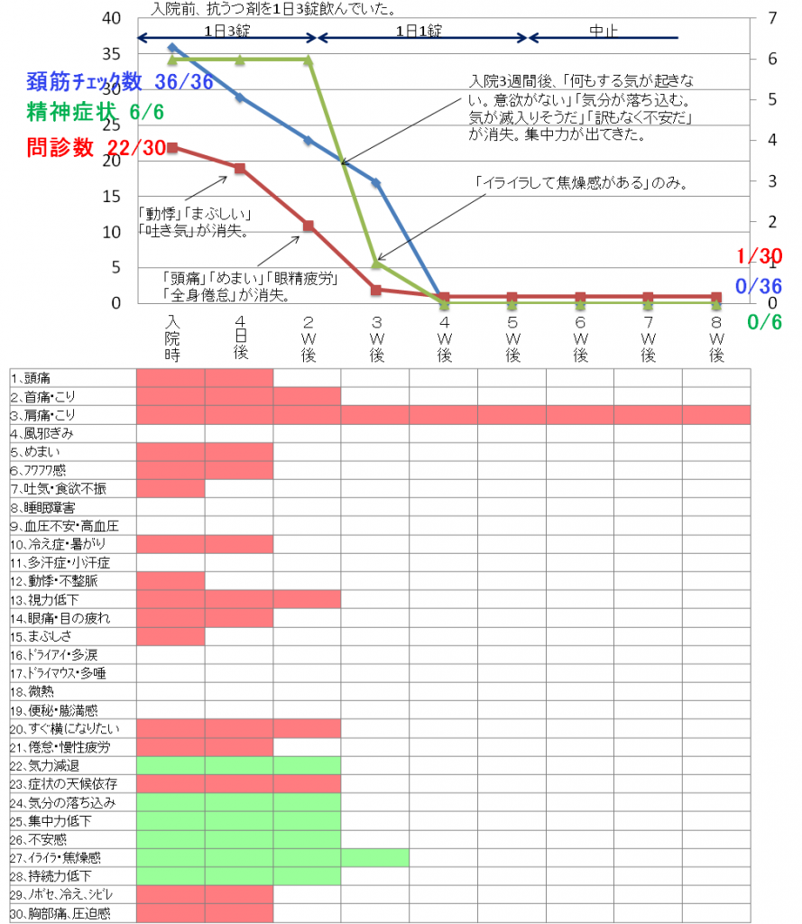 その後はどんどん回復して日3回飲んでいた抗うつ剤も日1回となり、1ヶ月後には服用しなくともすむようになりました。そして頭痛、首の痛みもまったくなくなり数年前に戻ったような気分となりました。