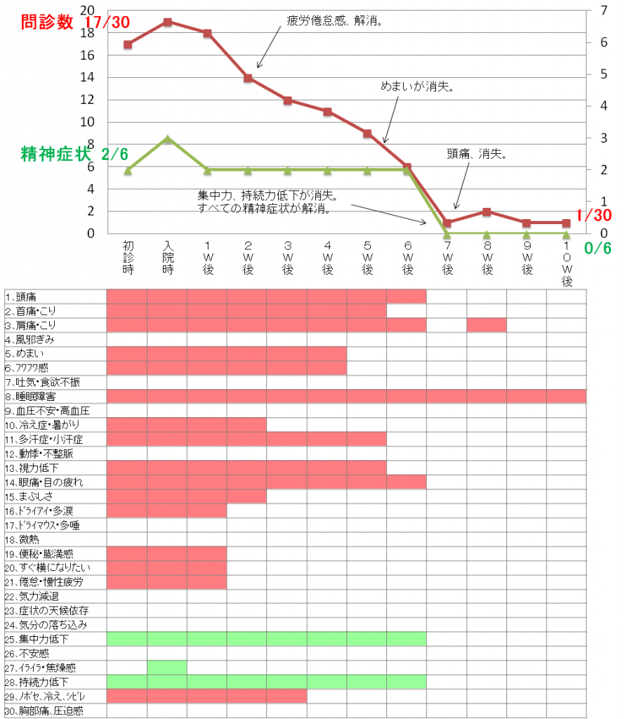 5週目から症状が和らぐのが解り、6週終わり頃には頭痛を感じない時間の方が圧倒的に永くなっていました。そして、11月3日、起床時から全ての症状を感じることなく消灯まで爽やかな1日を過ごせました。それは以前の健康だった頃を思い出させてくれるような感覚でした。入院から47日目のことです。その後、症状は出現と消失を幾度か繰り返しながらも体調は良好な状態を維持出来ていました。