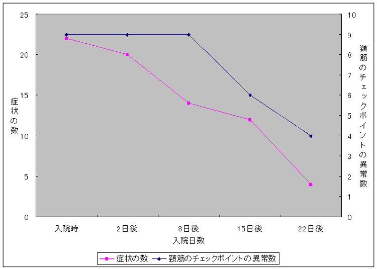 1 頭が痛い、頭が重い。 2 頚が痛い、頚が張る。 3 肩が凝る、肩が張る。 6 ふりむいた時や歩いている時、何となく不安定。 9