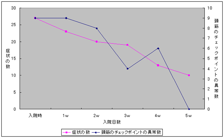 | 初診時 | うつ症状を中心に頭痛、頚こり、肩こり、メマイふらつき、不眠、発汗異常、体温調節異常、心悸亢進、目の症状として像がぼやける(これは診察で瞳孔が大きくなり光を当てると少し収縮してすぐ元の大きな状態に戻ることが原因であった。)目が疲れやすい、光が眩しく目を開けていられない、目が乾燥する、つばが出すぎる、微熱が出る、胃腸の調子が悪い、いつも体がだるく横になりたい、疲れやすい、集中力が低下し、焦燥感がある、根気がなくなり仕事を続けられなくなる、頭が熱いのに手足が冷たい、胸を圧迫される感があり痛い、天気が悪くなる前に症状が強くなる、など問診30問中27の異常があった。診察で、頚筋のチェックポイント9ヶ所のうち、全部に10年以上続く古い異常所見が見られた。 | ||