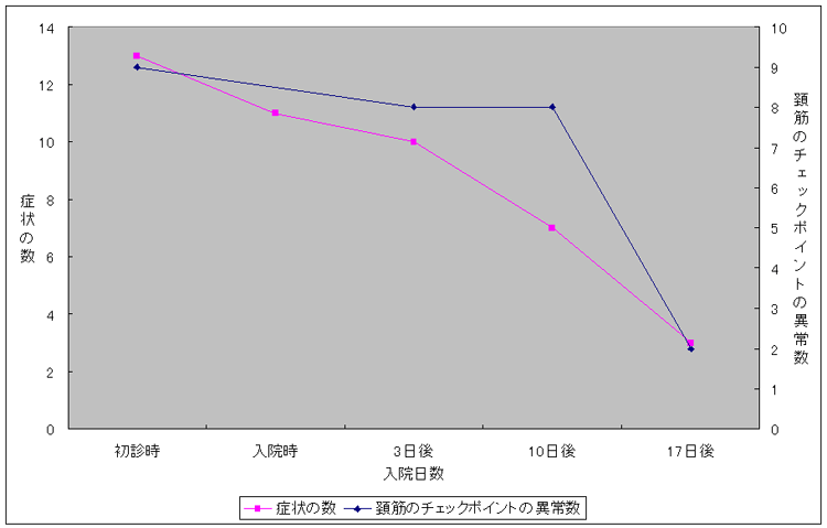 診察上、頚筋の異常は3分の1となった。2週間目に症状は3となり、未だ完全とは言えない状態であったが家庭の事情で3週間で退院した。