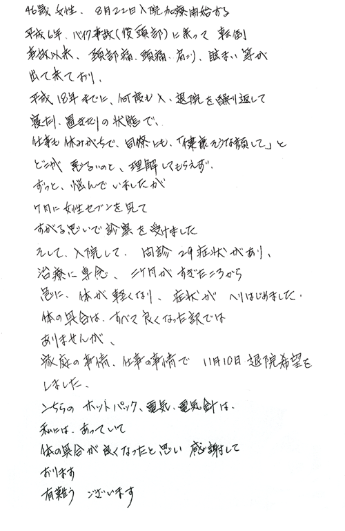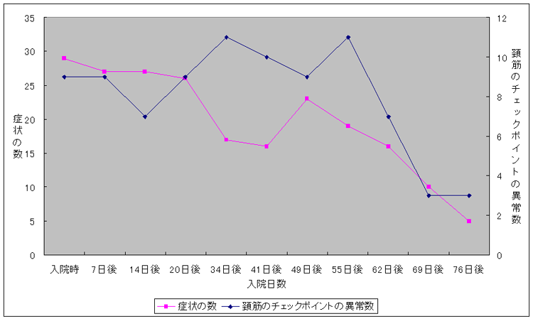 前述の症状の他、不眠、血圧が上下して、暖かいところに長時間いられない、異常に汗をかく、急に脈が早くなる。見る物全て何となくぼやけている。目が疲れて開けていられない、光がまぶしい、ドライアイ、微熱がつづく、胃腸の調子が悪く、座っていても立っていても体がだるく、すぐ横になりたくなり、全身の倦怠感がある。何もする気が起きず、気分が落ち込み、いつも訳もなく不安でイライラして焦燥感が強い、根気や集中力がなくなり、仕事に間違いが多くなった。 頭がのぼせて手足が冷たい、胸も圧迫されてしまうようになり痛みがある、天気が悪くなると症状が強くなるなど沢山の症状があり、問診30問中29の異常があり、診察でも頚筋のチェックポイント9ヵ所全部に異常があった。 |