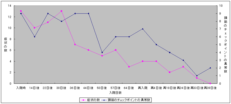 平成18年6月追突事故でムチウチとなり他院に搬送された。さらに他院に転院したが頭痛が強く脳脊髄液減少症ではないかと疑われて検査もした。症状改善せず当院へ転院。頭痛、頚部痛、メマイふらつき、立っていても不安定で、嘔気、不眠が続いた。目が疲れやすく、すぐ横になりたい、横になると楽になる。全身がだるく、症状は天候と密接な関係もあるが、手足が冷たく頭はのぼせて熱くなるという症状があった。入院後、薬物治療法が発効し自覚症状も他覚的な頚筋の異常もなくなり退院した。