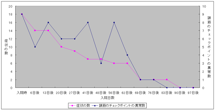 天井の回るメマイで発症し、その他次々といろいろな症状が出現し、考えられるあらゆる病院を受診したが症状改善せず、当院入院して18あった症状が0となり、頚の他覚的異常所見も消失し完治した。