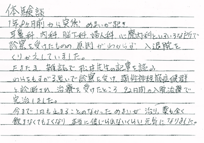 1年8ヶ月前から突然めまいが起き、耳鼻科、内科、脳外科、婦人科、心療内科といろいろな所で診察を受けたものの、原因が分からず入退院をくりかえしていました。たまたま、雑誌で松井先生の記事を読み、わらをもすがる思いで診察を受け、頚性神経筋症候群と診断され治療を受けたところ、92日間の入院治療で完治しました。今まで、1日も止まることのなかっためまいが治り、薬も全く飲まなくてもよくなり、本当に信じられないくらい元気になりました。