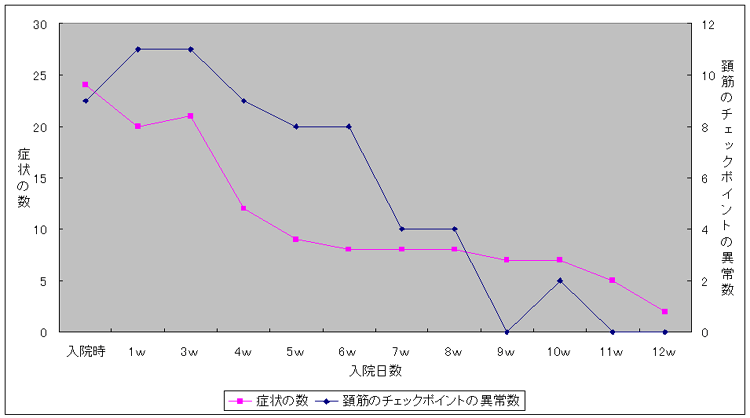 発症から9ヵ月目に、脳神経外科に1ヵ月入院してあらゆる検査を受けたが原因は分からなかった。又、これとは別に脊髄の専門病院を受診したがわからなかった。発症から1年半後に当院受診した。その時、めまい以外に頭痛、頚部痛、肩こり、嘔気、不眠、血圧が不安定、体温調節異常、動悸や目を開けていられない、つばが出すぎる、胃腸の調子が悪い、全身がだるい、いても立ってもいられずすぐ横になりたい。何もする意欲がない、気分が落ち込んで集中力もなくなり、訳もなく不安で、いつもイライラして焦燥感があり、仕事が出来なく、手足が冷たいのに頭が熱くなるなど症状が24もあり、診察で他覚的にも、頚筋のチェックポイント11全部に異常がみられたので入院加療を行った。