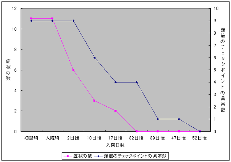 半年前急に何もしたくなくなり、全身がだるく体が疲れやすくなった。その2ヵ月後、指がふるえ、心療内科を受診したらうつ病と言われた。その後うつ病を信じて通院して抗うつ剤をつづけてのんでいる。ある時、週刊誌に頚性神経筋症候群の記事をみて、まさに自分はこの病気だと確信して当院を受診。受診前は気分が沈んで、疲れやすく何もしたくない状態で横になって寝ていたかった。頚や肩も痛かった。考えてみると、頚や肩のこりは若い頃よりあった。このごろ、メマイ、ふらつき、不眠、体温の調節が出来にくい、汗が異常に出る、安静にしているのに心臓がドキドキして脈が速くなる、目が疲れやすい、天候が悪くなる前に症状が強くなる、精神症状も何事に対しても意欲がなくなり、気が滅入って、集中力がなくなり、根気もなく、一つのことをつづけられなくなり、わけもなくイライラして、焦燥感が出て、理由のない不安感があった。抗うつ剤を飲んでいても、このような精神症状が続いていた。入院してもはじめの3週間は症状の改善がみられなかったが精神症状だけは改善が見られた。入院前は電車にも乗れない、人混みに行けなかったのが不思議なくらいよくなった。入院1ヵ月半たったとき症状もほとんど消えてきて、入院前と比べると、うそのようだと喜んでいた。しかしこの時点で診療で他覚的異常がまだ残っていたので治療をつづけた。治療を長引かせている原因は頚椎の椎間板が後方に突出していることである。長くなるので家庭の事情もあり11週目に退院してあとは外来で加療を加えることにした。一般に症状と他覚的所見の改善はズレがあり他覚的所見のなくなる時が完治であるが治療期間全体の55%ぐらいで症状は消失する。