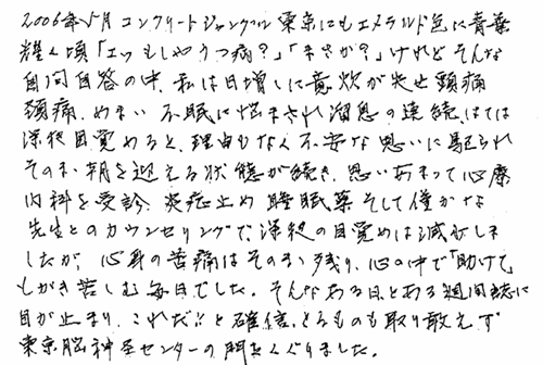 2006年5月コンクリートジャングルな東京にもエメラルド色に青葉輝く頃「エッ もしやうつ病?」「まさか?」けれどそんな自問自答の中、私は日増しに意欲が失せ頭痛、頚痛、めまい、不眠に悩まされ溜息の連続、はては深夜目覚めると、理由もなく不安な思いに駆られそのまま朝を迎える状態が続き、思いあまって心療内科を受診。炎症止め、睡眠薬、そして僅かな先生とのカウンセリングで深夜の目覚めは減少しましたが、心身の苦痛はそのまま残り、心の中で「助けて」もがき苦しむ毎日でした。そんなある日、とある週刊誌に目が止まり、これだ!!と確信。とるものも取り敢えず東京脳神経センターの門をくぐりました。