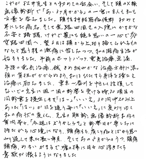これが松井先生との初めての出会い、そして頚のX線画像診断で「あゝ、3ヶ月かかる」の一言に主人も私も言葉を呑みました。頚性神経筋症候群、初めて耳にした病名。そして遠路四国への入院にかすかな不安と躊躇、けれど藁にも縋る思いの一心で9/5空路四国へ。翌6日は頚から上、切り捨てられるものならと思う程の激痛に苦しみつつ、私の闘病生活が始まりました。午前のホットパック、電気治療、点滴、午後の電気治療、鍼、きめ細やかな治療方針に添い頚に負担がかからないよう、私はひたすら身体を横たえ治療に励みました。東京~香川を忙しく往復しておいでの先生に週一回の診察を受ける時、30項目の問診表を提出します。「はい」「いいえ」30問中20以上あった「はい」が日を追う毎に「いいえ」に変わりゆく私の症状の変化。先生の触診、画像診断、私からの質問等々、「今週はどうかしら?」と診察日が楽しみに待たれる心境になり、頭痛もち、肩こり症とばかり思いやり過ごして来た長い年月、そしてあの5月からのうつ、頚痛、頭痛、めまいがまるで嘘の様に日々心浮きたち意欲が漲るようになりました。