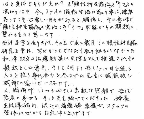 西洋医学を全うされ、その上で永い歳月この頚性神経筋の研究を重ね、未だかつてどなたも取り組まれなかった和洋双方の治療効果に自信を以て推進され、その毅然とした勇気、そして何より苦しみに日を送る人々を救う事に全力を尽くされた先生に感服致し感謝の思いで一杯です。