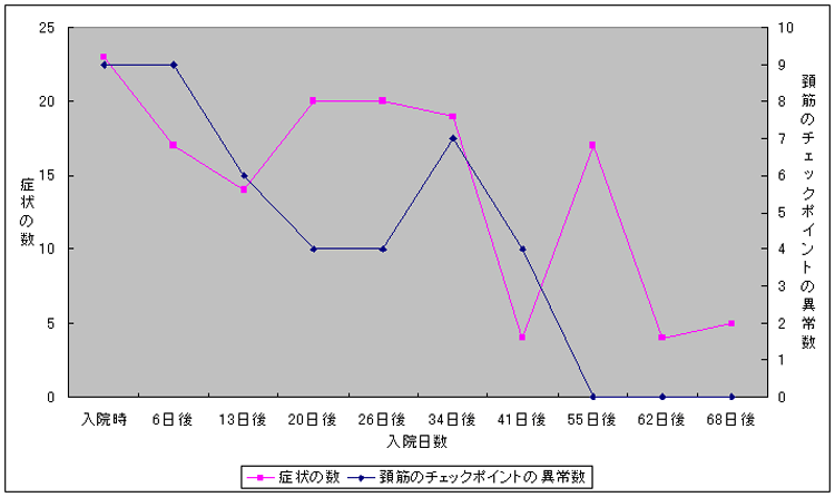 1 頭が痛い、頭が重い。 2 頚が痛い、頚が張る。 3 肩が凝る、肩が張る。 4 風邪をひきやすい。 6 ふりむいた時や歩いている時、何となく不安定。 8 夜寝つきが悪い。途中で目が覚める。 12 静かにしていても心臓がドキドキする。動悸がする。 13 目が見えにくい、何となく像がぼやける。 14 目が疲れやすい、または痛い。 16 目が乾燥する、又は涙が出やすい。 17 つばが出やすい。出過ぎる。 18 微熱がでる。 19 胃腸の調子が悪い。腹部膨満感がある。 21 疲れやすい、何となくだるい、全身倦怠感。 22 何もしたくない、たいそう、億劫、意欲がない。 29 頭がのぼせる。手足が冷たい。しびれる。 30 腹部が痛い。腹部圧迫感がある。胸がしびれる。