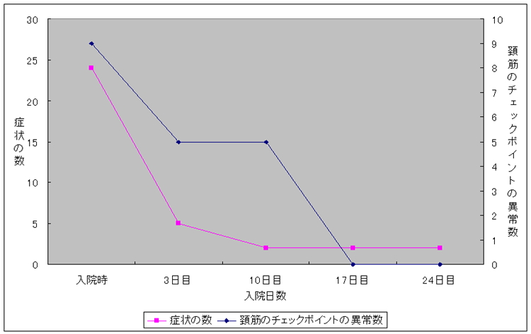 頭痛、頚こり、肩こり、吐気、不眠、汗が出やすい、目がボヤける、目が疲れる、目が痛い、涙が出る、つばが多量に出る、微熱がある、胃腸の調子が悪い、全身が疲れる、気分が滅入り、わけもなく不安でイライラして焦燥感があり、頭がのぼせて、手足が冷たく、天気が悪くなりだすと症状が強くなるという状態であった。当院入院待ちの間にも、めまいと嘔気、嘔吐があった。 | |