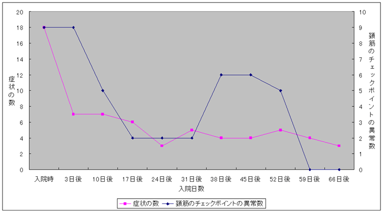 症状は30問中18あったが他覚的異常は頚筋の11チェックポイント中9あった。