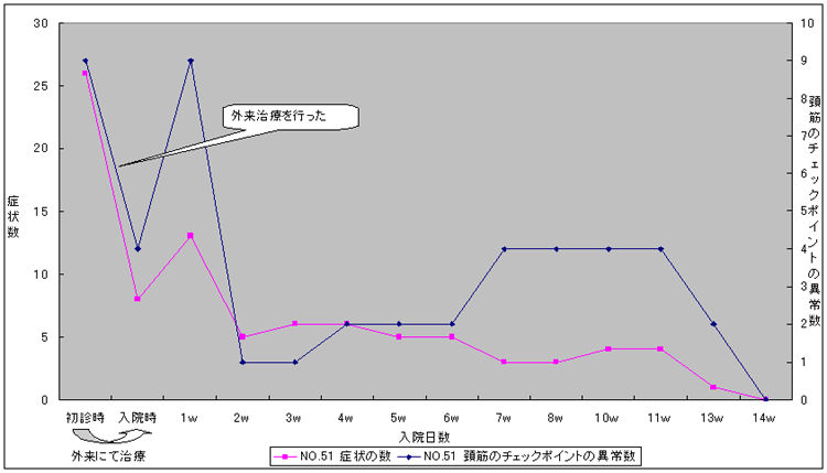 上記症状の他、胸部圧迫感、うつ症状、涙腺刺激症状、目が痛い、目が疲れやすい、見るものがぼやけて見える、汗が異常に出る、夜寝られない、ふらつきがあり、肩が凝って頭が痛い、など30問の問診中、26の症状があった。頚筋の異常はチェックポイント9ヶ所全部の異常があった。その後、入院までに1週間外来通院をした。 | 26 |